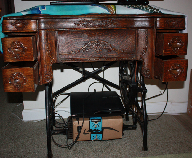 pride for it. Yippy, skippy, I was so happy I could dance! So now it sits with pride in my living room, woo hoo!As you can see in this picture it is decorated to the nines and has its original finish. I would show you the treadle but the unit for running the t.v. is presently sitting on it. I can assure you on first attempt it did function, so all that I see that it needs is a good oiling and cleaning.